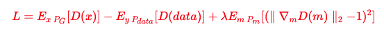 当这里的K取值为1的时候,就是上面的1-Lipschitz函数,不过问题来了,对判别器加了这个约束,如何在训练的时候体现出来呢?原始论文中采取了weight clipping技巧,即把参数w限制在[-c, c]中间;后来有人提出了WGAN-GP,它的论点是如果一个函数是1-Lipschitz函数,等价于它所有对x的梯度的绝对值都不大于1,这句话表现到损失函数上就是加了一个惩罚项,并且实验中发现梯度的绝对值越接近1收敛越快,最终损失函数形式如下: