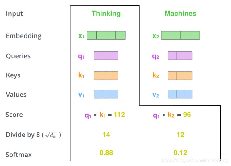 得到向量之后就可以进行编码了,考虑上下文,如上文提到的bank同时有多个语义,编码这个词的时候要考虑到其他的词,具体的计算是q1 k1做内积 q2 k2 做内积得到score,内积越大,表示约相似,softmax进行变成概率。花0.88的概率注意Thinking,0.12注意macheins这个词