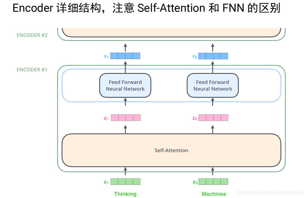 如下图例子给定两个词 thinking和machies,首先通过word embedding把它变成向量,通过self-attention,把它变成一个向量,这里的sefl-attention时考虑上下文的。然后再接全连接层,计算z1的时候我要依赖x1 、x2 、x3整个序列的,才能算z1,z2也一样,我算r1的时候时不需要z2的,只要有z1我就可以算r1.只要有z2就能算r2,这个是比较大的一个区别,这样就可以并行计算。