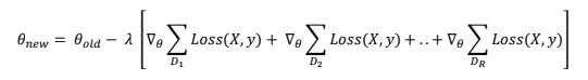 同步 SGD 所依赖的核心技巧是将更新规则中的求和在更小的 (mini)batch 子集上进行分割。D 被分割成 R 个子集 D₁, D₂, . .(推荐每个子集具有相同数量的样本),所以  将标准的 SGD 更新公式中的求和进行分割,得到: