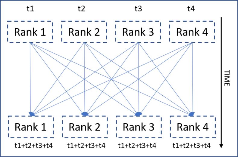 All-reduce 是一种同步通信方式,所有的 ranks 都被执行了一个 reduction 运算,并且得到的结果对所有的 ranks 都是可见的。下图介绍了这个思想(将求和作为 reduction 运算)。