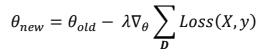 其中 D 是一个样本集合(mini-batch),θ 是所有参数的集合,λ 是学习率,Loss(X, y) 是某个损失函数在 D 中所有样本上的均值。