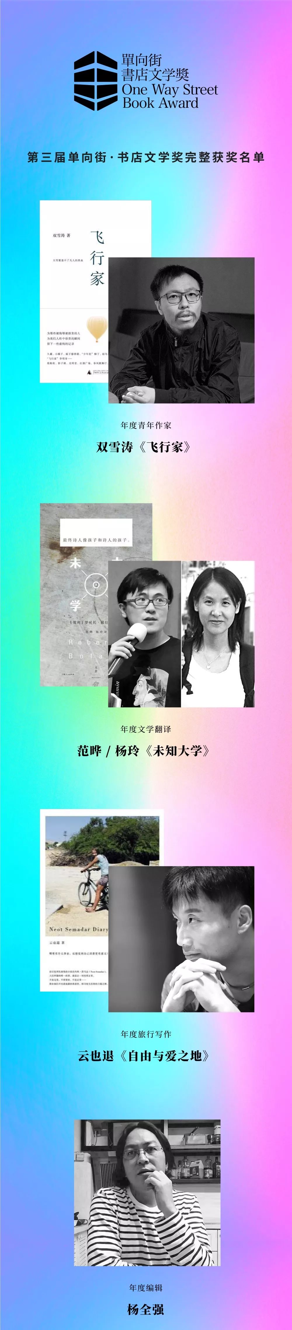 除此之外,第三届单向街·书店文学奖还颁出了年度作品、年度旅行写作、年度文学翻译、年度编辑、年度批评奖。