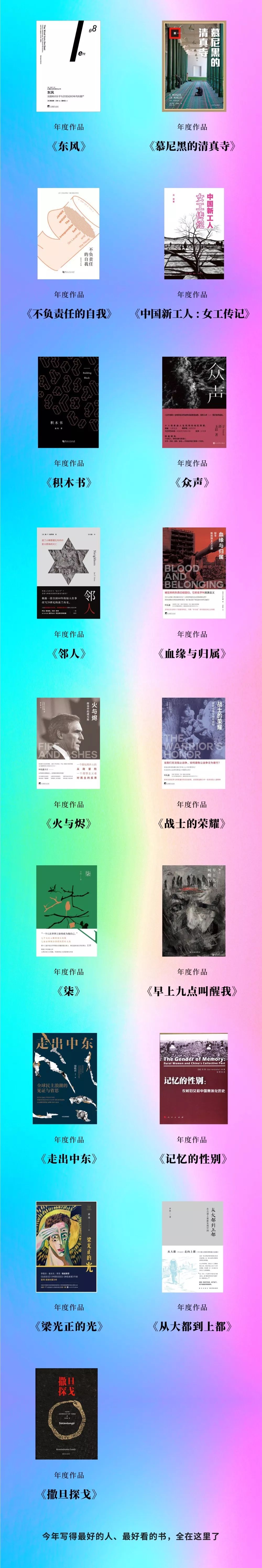 获得年度作品奖的,一共有 15 本书:《东风:法国知识分子与 20 世纪 60 年代的遗产》《慕尼黑的清真寺》《不负责任的自我》《早上九点叫醒我》《走出中东》《记忆的性别》《中国新工人 : 女工传记》《撒旦探戈》《积木书》《众声》《邻人》《柒》《梁光正的光》《从大都到上都:在古道上重新发现中国》以及叶礼庭作品系列。