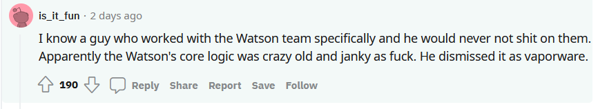 「我认识原先在沃森健康工作过的人,提起产品没有一句好话。很显然,沃森的核心逻辑老掉牙还很烂。他将之描述为太监软件。」