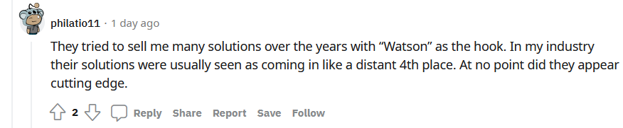 「我们这些顾客通常把沃森的软件排在第4选择顺位,他们从来没做出过真正业界前沿的产品。」
