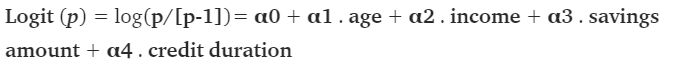 Logit(p)= log(p / [p-1])=α0+α1.年龄+α2 . 收入+α3 . 储蓄金额+α4 . 信用期限
