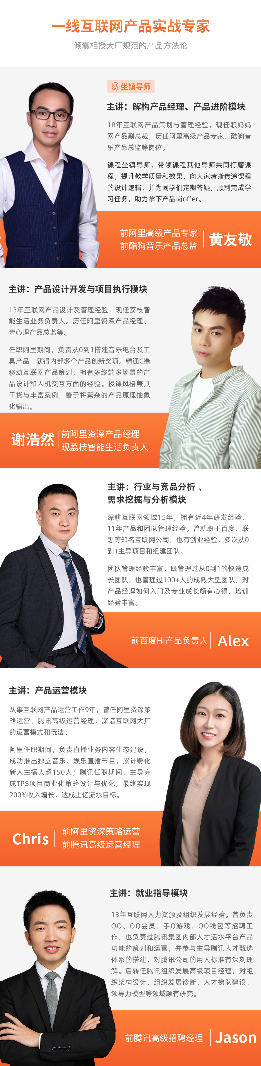 他们不仅拥有多年产品实战经验,而且经历过大厂上亿项目,在课程中能够毫无保留地,把他们多年沉淀下来,且依然实用的产品方法论传授给大家。