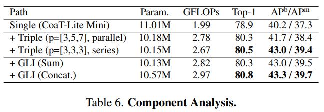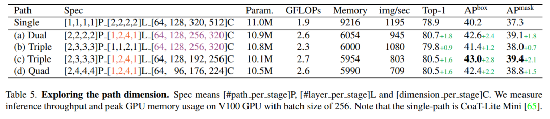 为了保持可比性的参数和FLOPs,增加路径的数量需要减少通道C或层数L(即,transformer encoder的数量)。作者通过减少C而不是L,从单路径(即CoaT-Lite baseline)扩展到triple-path。在消融研究中,验证了减少C比减少L获得更好的性能(见表5)。由于stage2的特征分辨率较高,导致计算成本较高,作者在stage2中将triple-path模型的路径数设置为2。从stage3开始,三路径模型有3条路径。