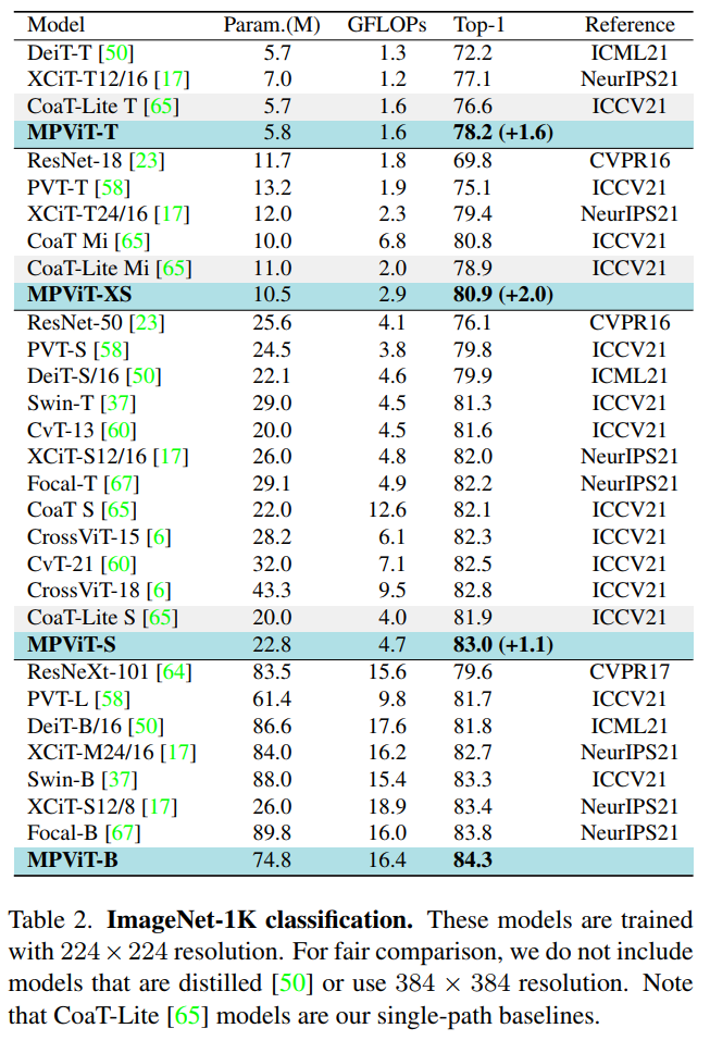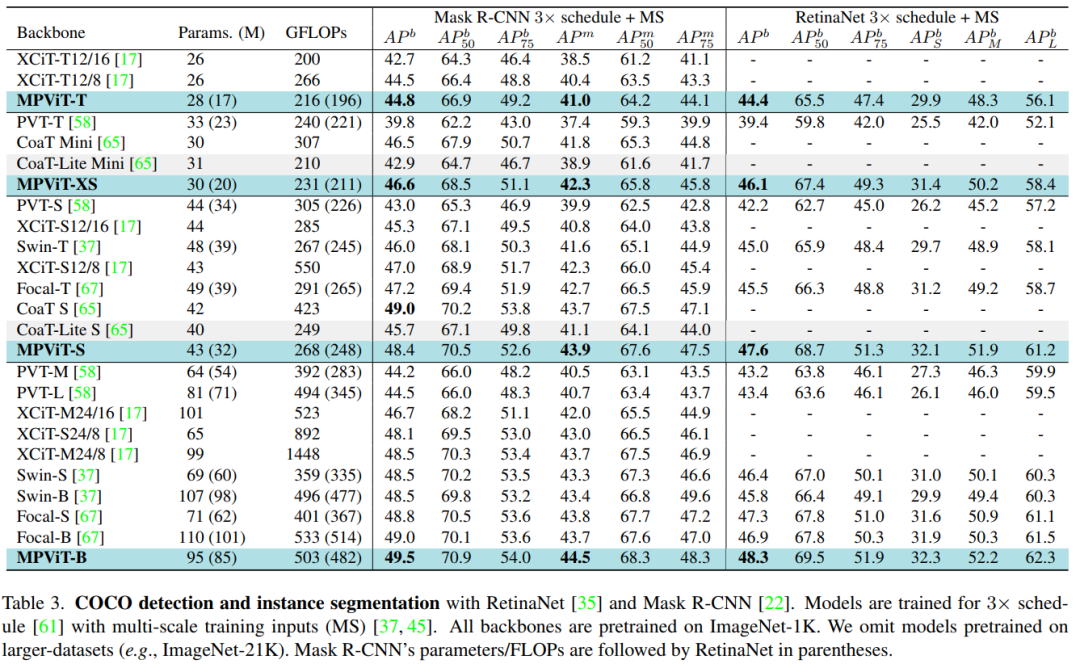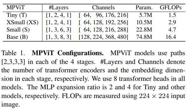 作者还发现,虽然 triple-path和双路径在ImageNet分类中产生相似的精度,但 triple-path模型在密集预测任务中表现出更好的性能。因此,建立了基于 triple-path结构的MPViT模型。MPViT的详细情况见表1。