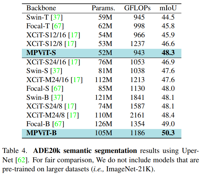 CrossViT利用了不同的patch大小和单级结构中的双路径,如ViT和XCiT。然而,CrossViT的分支之间的相互作用只通过[CLS]token发生,而MPViT允许所有不同规模的patch相互作用。此外,与CrossViT(仅限分类)不同的是,MPViT更普遍地探索更大的路径维度(例如,超过两个维度),并采用多阶段结构进行密集预测。