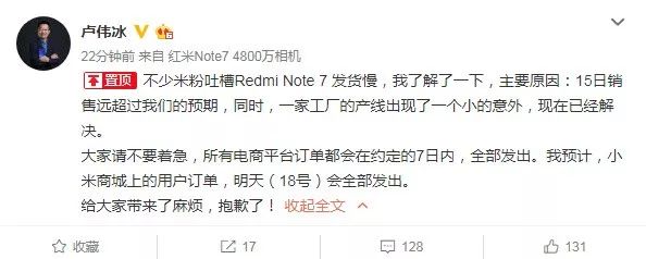 卢伟冰回应红米Note 7发货慢:销售远超预期,一家工厂产线出现小意外