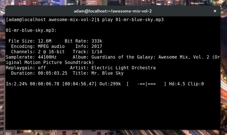 接着 sox 就会为你播放。除了单独的音频文件外,sox 还支持 m3u 格式的播放列表。