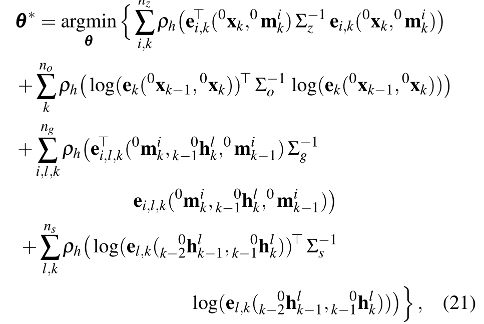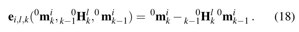 四种测量/观测被整合到一个联合优化问题中:三维点测量,视觉里程计测量,动态目标上点的运动的观测和目标平滑运动的观测。定义三维点的测量模型误差为: