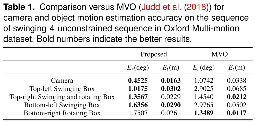 表1。VDO-SLAM与MVO (Judd et al. (2018))在牛津多运动数据集中的swinging-4_unconstrained序列上对于相机和目标运动估计精度的比较结果。粗体的数字表示更好的结果。