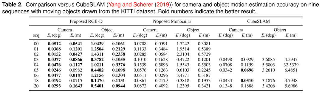 表2。VDO-SLAM与CubeSLAM (Yang and Scherer (2019))在KITTI数据集的第九个序列上对于相机和目标运动估计精度的比较结果。粗体的数字表示更好的结果。