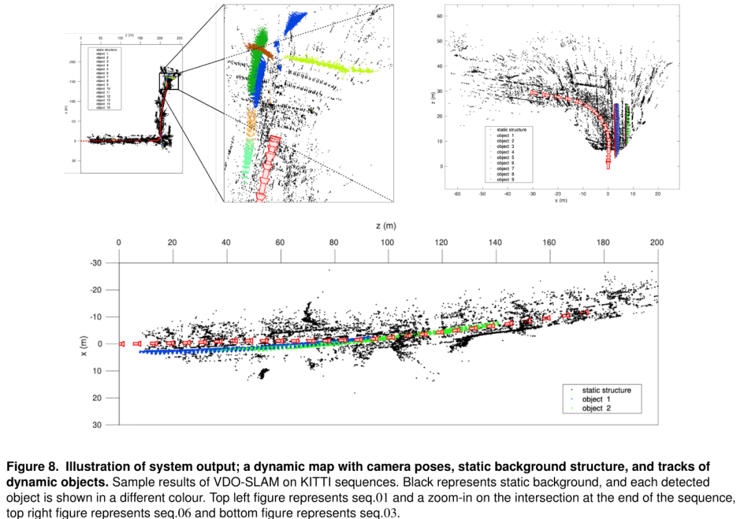 图8。系统输出的图例展示:含有相机位姿,静态背景结构,和动态目标位姿轨迹的动态地图。如图是VDO-SLAM对KITTI序列的样本结果。黑色点代表静态背景,每个检测到的(运动)目标都用不同的颜色显示。左上角的图片表示01序列,并对序列末尾结果进行了放大展示,右上角的图片表示06序列,底部的图片表示03序列。