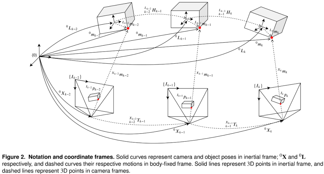 设0Xk,0Lk 分别为在全局参考系0中k时刻的机器人/相机和目标的三维位姿,其中k 为时间步长的集合。特别地,在我们的表示法中,大写字母用来表示指标集。图2中将这些位姿转换显示为实线。