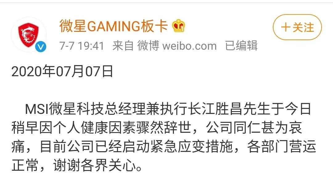 7月7日晚间消息,微星科技官方发布公告,确认公司总经理兼 CEO 江盛昌于今日稍早因个人健康因素骤然辞世。微星表示,公司同仁甚为哀痛,目前公司已经启动紧急应变措施,各部门营运正常。公告发布后,大量微星用户和网友纷纷表达哀悼。