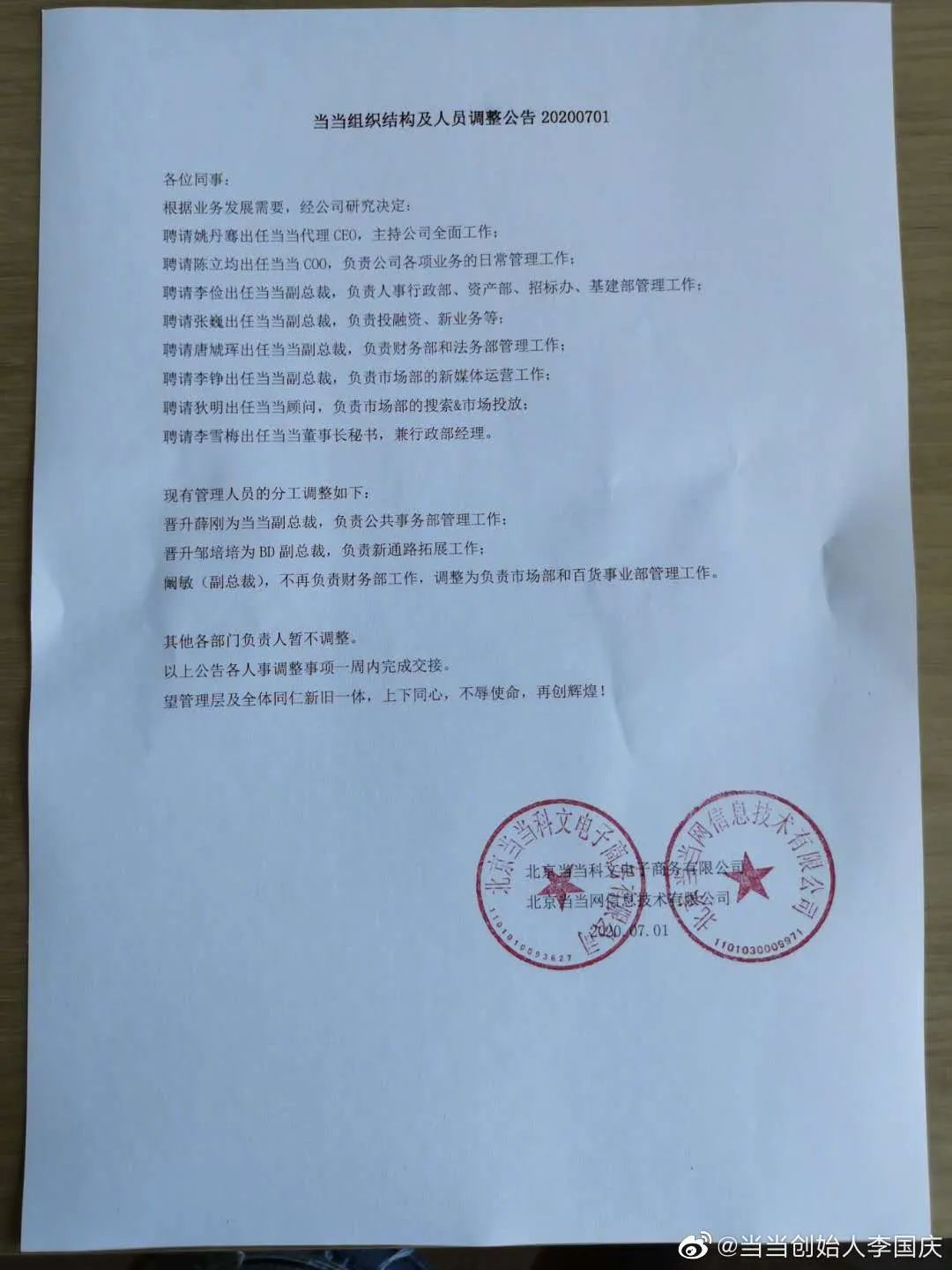 36氪获悉,李国庆昨日下午宣布调整当当网组织结构及人员。聘请姚丹骞出任当当代理CEO,主持公司全面工作;聘请陈立均出任当当COO,负责公司各项业务的日常管理工作。