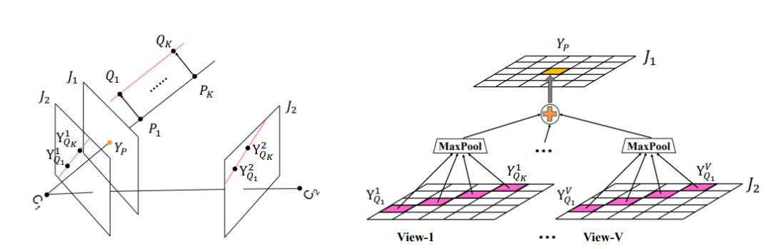 图2:左,三维空间中特定角度下的 P、Q 两点,在不同视角下的图像中的位置关系;右,基于几何位置关系的特征融合。
