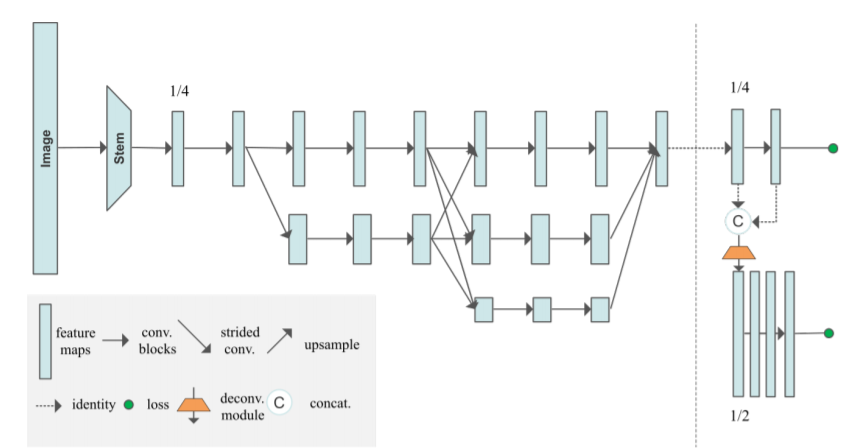 目前主流的自下而上检测关键点的热度图(heatmap)分辨率使用1/4 ,我们发现这个分辨率用于做关键点的精确度还是不够高。为解决此问题,我们在 HRNet 的基础上通过 transposed convolution 得到更高分辨率的特征。