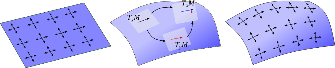 图3:左,图像的欧式平面上的平移;中,曲面上的测地平移;右,我们构造的平行标架定义的曲面上的平移。曲面上的平移在不同点处难以协调,而我们构造的曲面平移在局部与欧式空间一致,由此定义的 CNN 具有平移共变性和更高的特征学习效率。