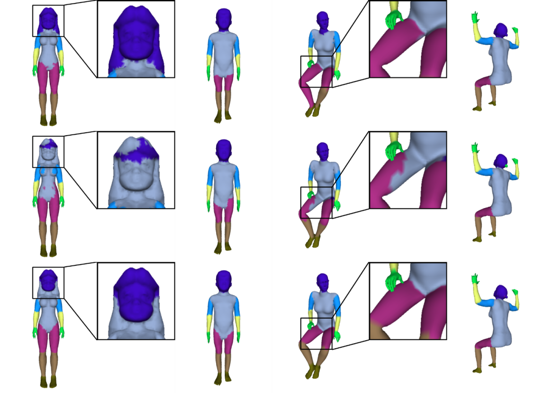 图4:人体表面分割结果。上中下行依次为:人工标注的 ground truth 分割、SOTA 方法的结果、我们的结果。可以看到,我们的结果更准确合理。