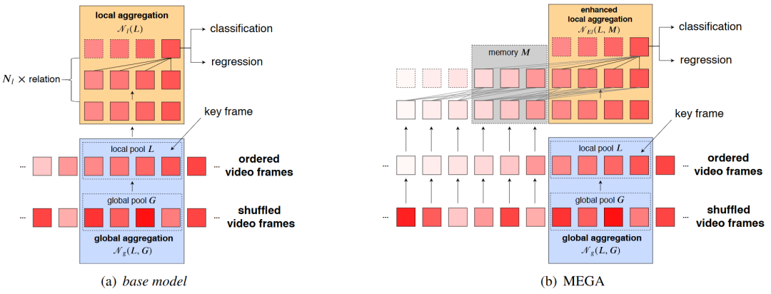 在视频物体检测任务中,由于相机失焦、物体遮挡等问题,仅基于图像的目标检测器很可能达不到令人满意的效果。一般来说,人类主要通过两类信息来辅助对质量较差的帧进行物体检测,即局部定位信息与全局语义信息。从这个角度出发,我们发现目前的视频物体检测方法都仅单独考虑了其中一种信息进行辅助目标检测。除此之外,另一个在现存方法中存在的问题就是整合规模不足,也就是关键帧能够使用信息的范围较少。