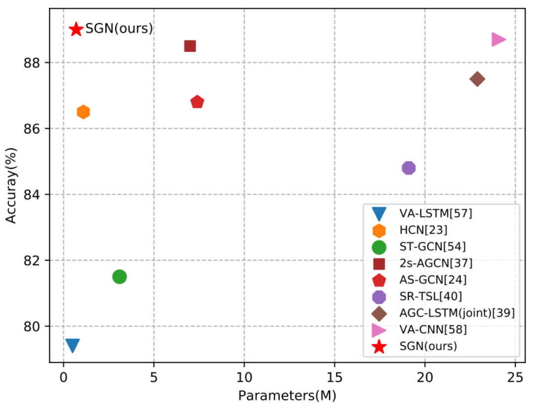 本文中,我们设计了语义引导的轻量神经网络 Semantics-Guided Neural Network(SGN)。如图6所示, SGN 方案仅需非常小的参数量(仅0.69M)就实现了很高的识别精度。