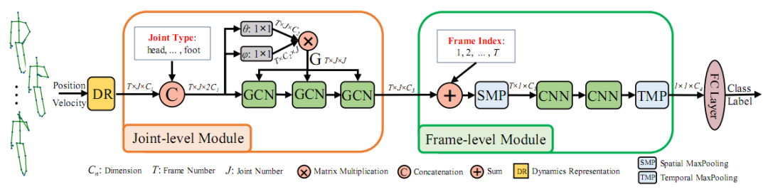 然而这些方法的研究大多只考虑性能的提升,而忽略了网络的优化设计和复杂度。在实际应用中,如何设计高性能的轻量级模型也非常重要。另外,对于表达一个关节点,除了坐标位置信息(我们称为 Dynamics)外,节点类型(joint type)和所处的帧(frame index)这些语义信息(Semantics)也对行为识别至关重要。例如两个运动轨迹相同的节点,会由于所属节点类型的不同,而对应不同的行为类别。然而,以往的工作往往忽略了对语义信息的显式利用。