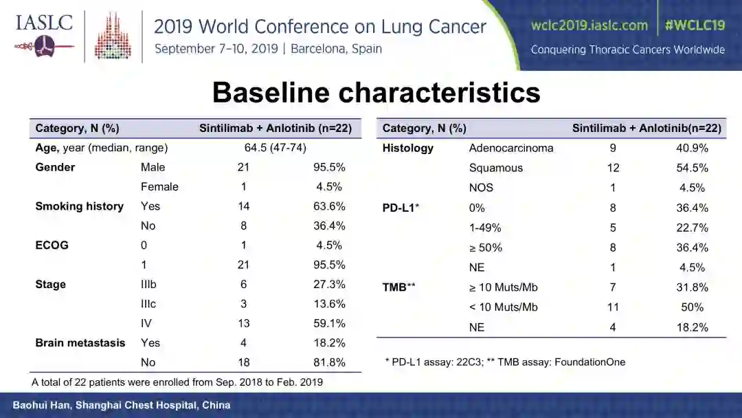 2018年9月至2019年2月,研究入组22例患者,男性占95.5%,63.6%的患者有吸烟史,鳞癌占54.5%,4例患者合并脑转移。同时21例中进行了PD-L1表达检测;18例患者进行了肿瘤突变负荷(TMB)检测(表1)。