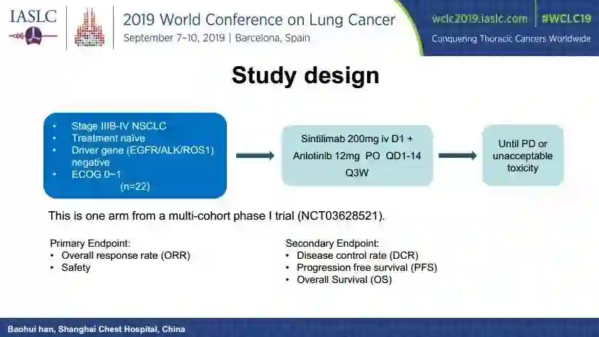 该研究纳入驱动基因(EGFR/ALK/ROS1)阴性、未经治疗的ⅢB~Ⅳ期NSCLC患者,年龄18~75岁,ECOG 0~1分。给予信迪利单抗(200mg,q3w)和安罗替尼(12mg/d,连续2周,休息1周),直至疾病进展(PD)或不可耐受的毒性。研究主要终点为ORR和安全性,次要终点包括DCR、无进展生存期(PFS)和总生存期(OS)(图1)。