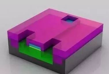 至此,晶体管已经基本完成。在绝缘材(品红色)上蚀刻出三个孔洞,并填充铜,以便和其它晶体管互连。