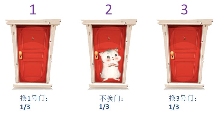 此时,换门也包括两种换法,但无论怎样选择,获奖率都各占1/3: