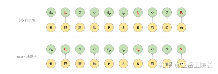 这里说一下用于表示序列标注结果的 BIO 标记法。序列标注里标记法有很多,最主要的还是 BIO 与 BIOES 这两种。B 就是标记某个实体词的开始,I 表示某个实体词的中间,E 表示某个实体词的结束,S 表示这个实体词仅包含当前这一个字。区别很简单,看图就懂。一般实验效果上差别不大,有些时候用 BIOES 可能会有一内内的优势