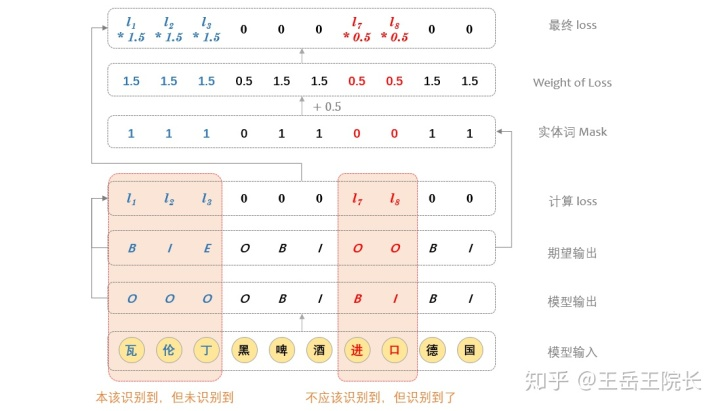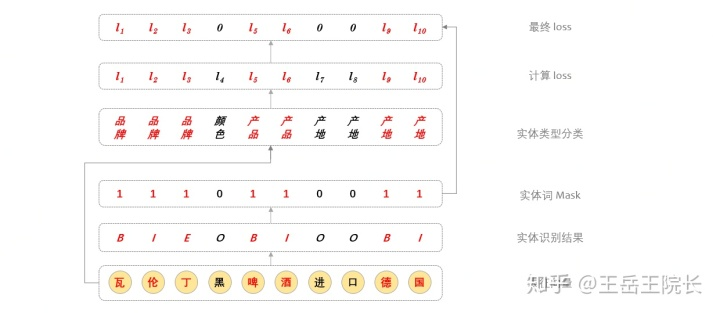 具体实现上这样写:在训练时,每个词,无论是不是实体词,都过一遍全连接,做实体类型分类计算 loss,然后把非实体词对应的 loss 给 mask 掉;在预测时,就取实体最后一个词对应的分类结果,作为实体类型。上图解释