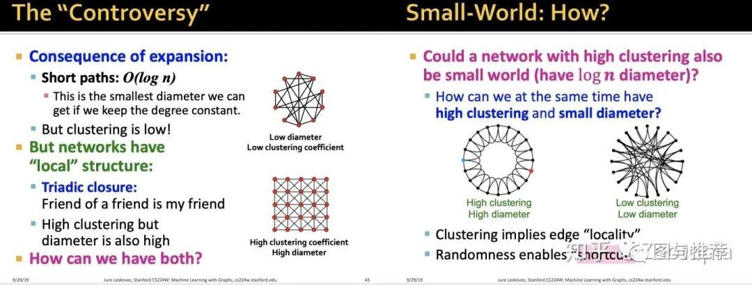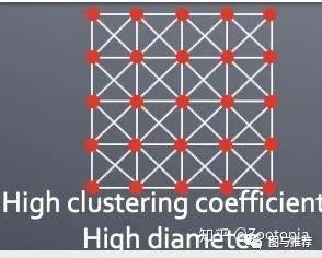 聚合系数和直径之间有一个矛盾之处在于:图的扩展(expansion)会使得保持度不变的情况下,直径越小也会导致聚合系数越小;而高聚合系数(高度连接的网络)却往往直径很大。那么怎么解决这个矛盾?基于以下两个思想: