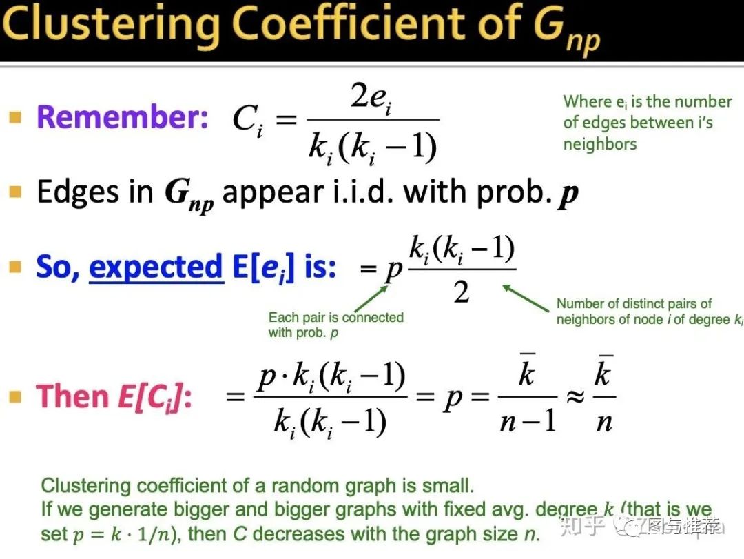 这里的计算比较显然,但是注意到E[Ci]可以发现当期望是一个固定值时,随着图规模越来越大,随机图的聚合系数会趋近于0。