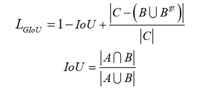 在预测中,使用Generalized IoU (GIoU) Loss作为BBox的损失函数,使用加权的非最大抑制(NMS)方法NMS。损失函数如下: