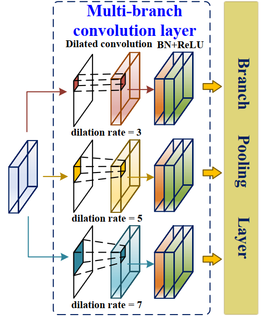 多分支卷积层包括扩张卷积、BN层和ReLU激活层。三个平行分支中的扩张卷积具有相同的内核大小,但扩张速率不同。具体来说,每个扩张卷积的核为3×3,不同分支的扩张速率d分别为1、3、5。