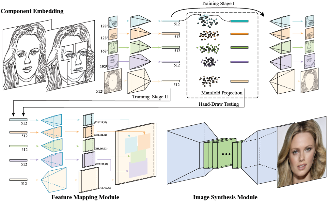 正所谓大道至简,本论文效果好,框架其实也不复杂。如图三所示,DeepFaceDrawing 系统由三个模块组成:内容嵌入模块(Component Embedding)、特征映射模块(Feature Mapping)、图像合成模块(Image Synthesis),在下文它们分别被简称为 CE、FM、IS 模块。