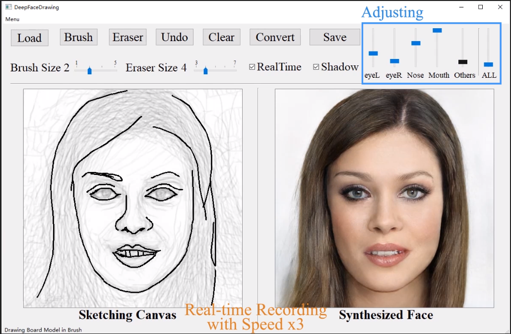 人脸图像的生成在各个行业有着重要应用,例如刑事调查、人物设计、教育培训等。然而一幅逼真的人脸肖像,对于职业画家也要至少数小时才能绘制出来;对于从未接触过绘画的新手,就更是难如登天了。新手绘制出来的人脸草图往往非常简陋抽象,甚至有不匀称、不完整。但如果使用智能人脸画板,无疑是有如神助。