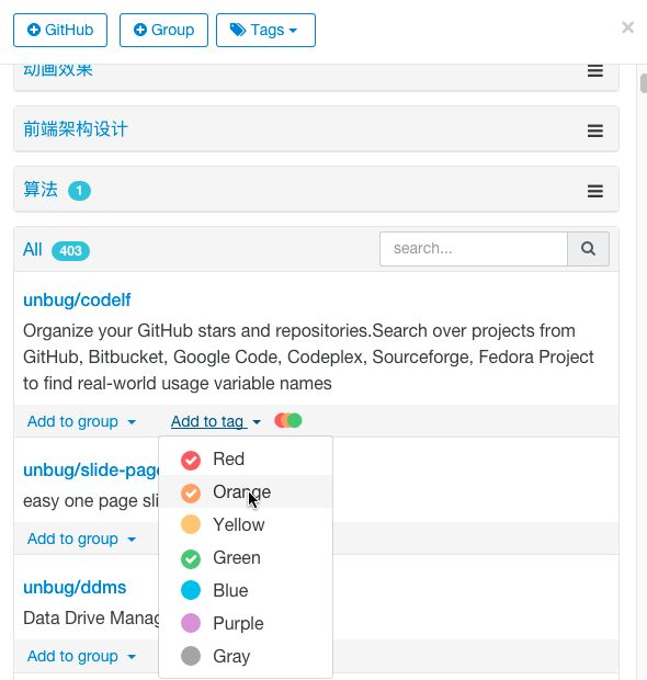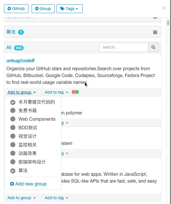 Codelf 还可以帮助开发者管理 Github 上的项目。我们看到一个喜欢的项目,第一个操作肯定是先点一下 Stars,时间久了,项目越来越多,快速检索到当下想用的是一个非常 nice 的功能,正好 Codelf 也具备这个功能。大家可以把想收藏的项目的 username 输入,然后进行分组或者直接用七个颜色的 Tag 简洁标记一下就可以了。不用绑定自己的 Github 账号。