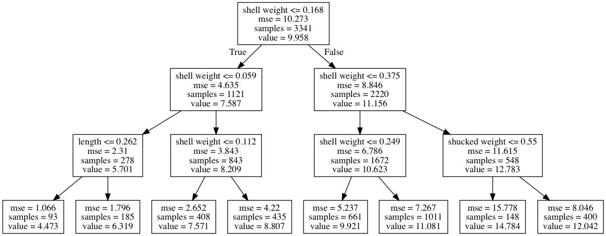 Let’s use the abalone data set as an example. We will try to predict the number of rings based on variables such as shell weight, length, diameter, etc. We fit a shallow decision tree for illustrative purposes. We achieve this by limiting the maximum depth of the tree to 3 levels.