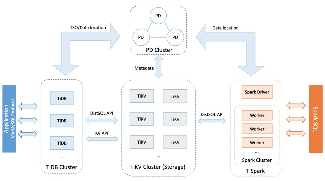 TiSpark 针对复杂 OLAP 查询做了一些优化。和 TiDB 层类似,TiSpark 也是一种无状态计算层,并与 TiKV 层交互。TiSpark 在设计上就是通过与 Spark SQL 的交互去处理复杂 OLAP 查询。因此,同时部署 TiDB 和 TiSpark 可消除 ETL 的代价,给出一种同时支持分析和事务需求的统一解决方案。