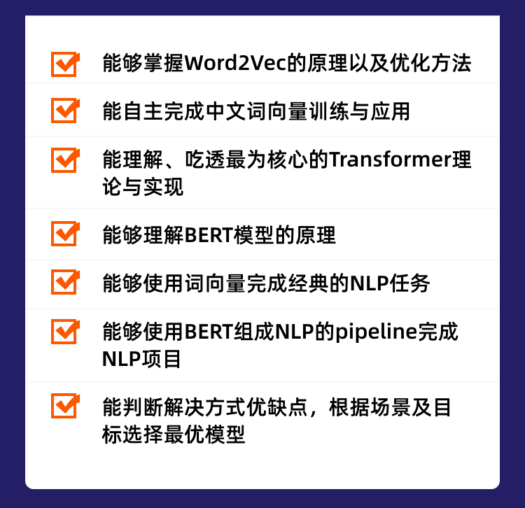 如果你是以上人群,那么这次训练营十分适合你。从原理到实操掌握词向量&BERT,让你业务实战能力up!快速实现升职加薪!