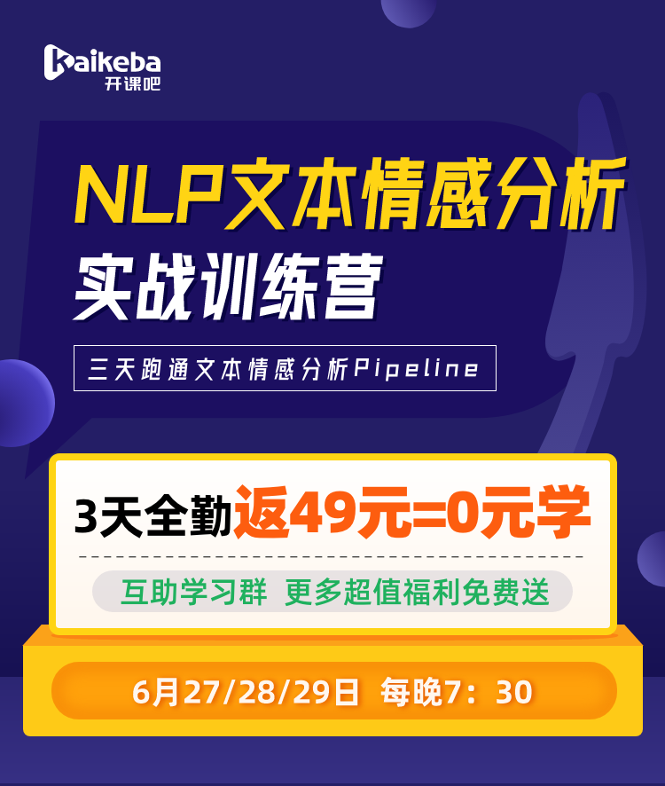 不懂情感分析,你在面试NLP算法工程师的时候很吃亏。本号强烈推荐你参加《NLP-文本情感分析Pipeline实战训练营》,以影评为例,进行文本评论情感分析实战,完整落地属于你自己的项目。让童鞋们快速上手相关工作。内容不错,推荐给你们。