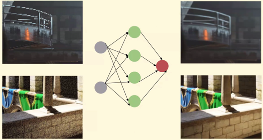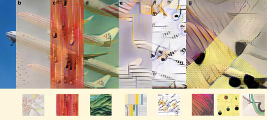 此外,Forbes教授还介绍了他们应用深度学习方法进行图像数据的光照重构和去噪的工作(如图5),图中左边展示了原始输入图片,右边展示了光照优化和去噪之后的效果,以及一些交互艺术项目,包括应用基于深度学习的风格转换技术生成丰富多彩的笔刷的Data Brushes项目(如图6),图中从b到d每一条竖直带状区域展示了使用DataBrushes将真实图片转换成不同风格的效果。