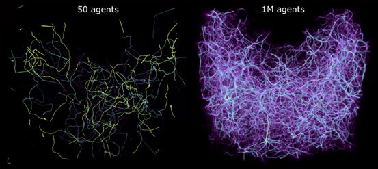 接着,针对艺术类工作对可视化研究的启发,Forbes教授首先介绍了他将数据艺术中常用的二维黏菌生长模型应用到三维网状数据艺术生成的工作,然后结合前面提到的IGM VIS项目,Forbes教授介绍了受此启发的Polyphorm项目。该项目针对天文学中的暗物质网问题,应用黏菌生长模型,结合仿真方法,通过可探测的星系数据成功重构了不可探测的暗物质网(如图4),图中展示了在黏菌生长算法中设置不同数量的个体得到的重构效果。Forbes教授还介绍了Polyphorm方法在计算语言学和3D打印等领域的广泛应用。